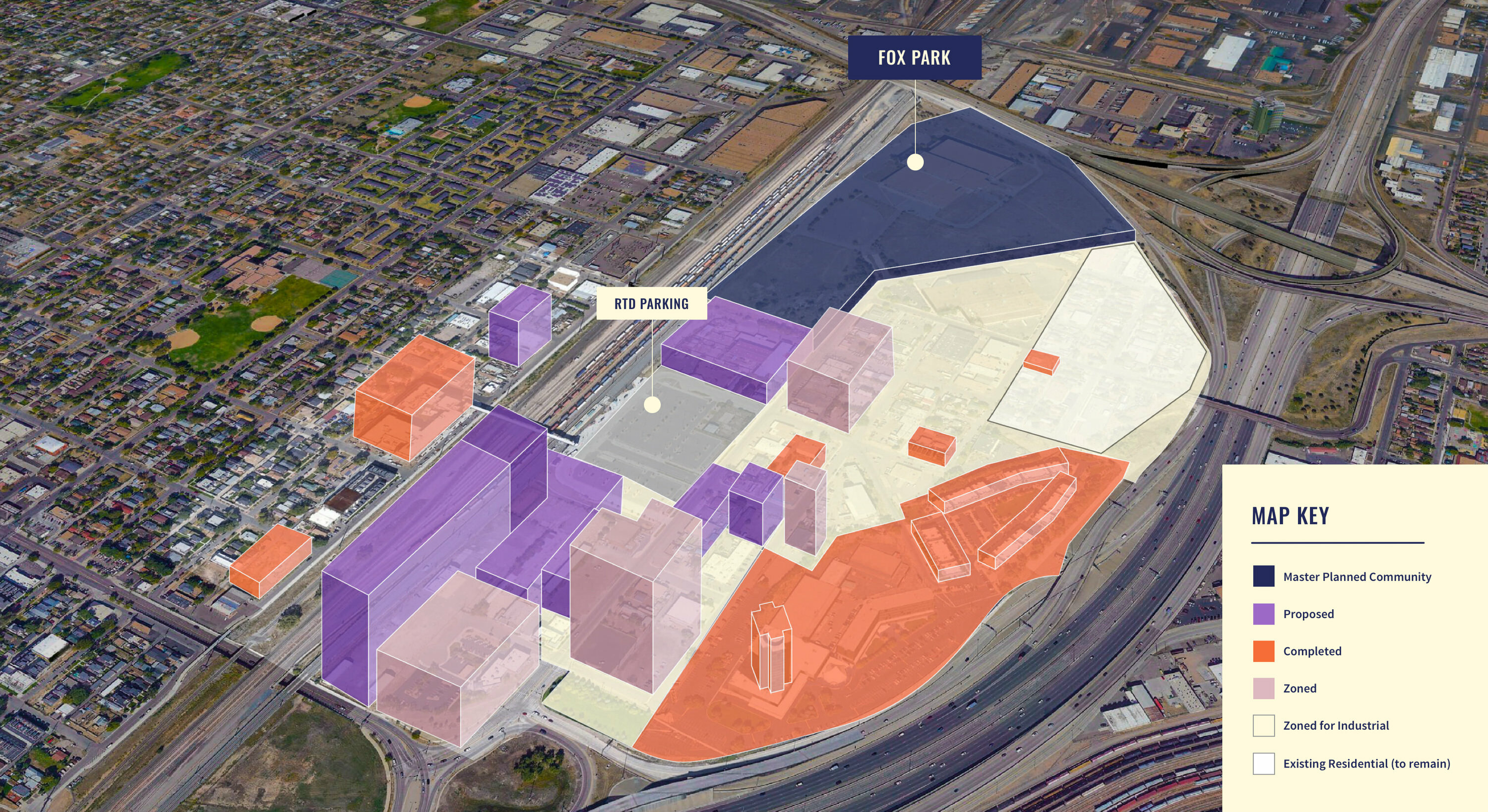 The City of Denver, through years of study and urban planning, has positioned this area to rapidly evolve into a dense and diverse urban environment that is efficiently connected to the best of Denver through the 41st and Fox transit station and quick freeway access.